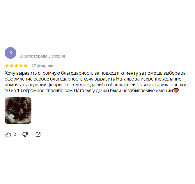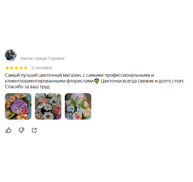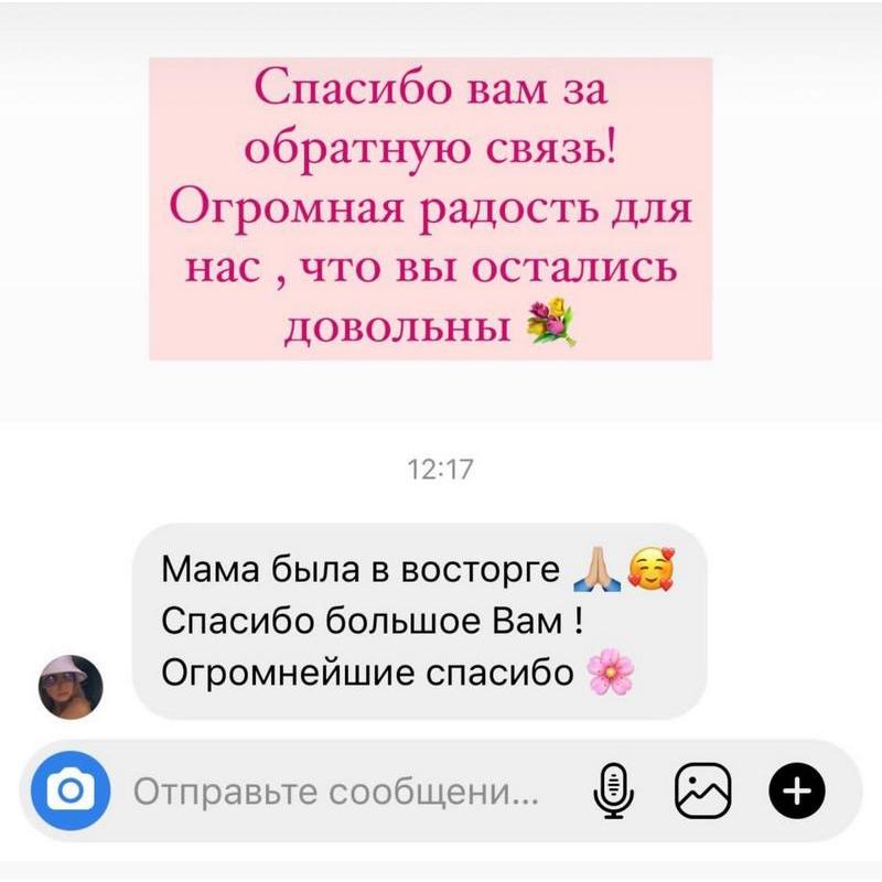 Спасибо огромное за работу! Заказывала цветы с доставкой, получатель в восторге, цветы свежие, оформление супер. Доставка без задержек. Ещё раз огромное спасибо!