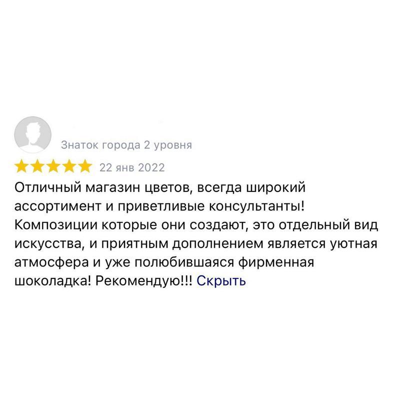 Зашел в этот салон посмотрев оценку на Яндексе и кажется не прогадал. Первый раз подбирал букет жене на юбилей, а некоторое время спустя заказал букет на день рождения дочке. Дочке букет уже заказал просто по телефону. Оба раза все были в восторге от букетов. Подбор цветов, оформление букета, все на высшем уровне! Большое спасибо!